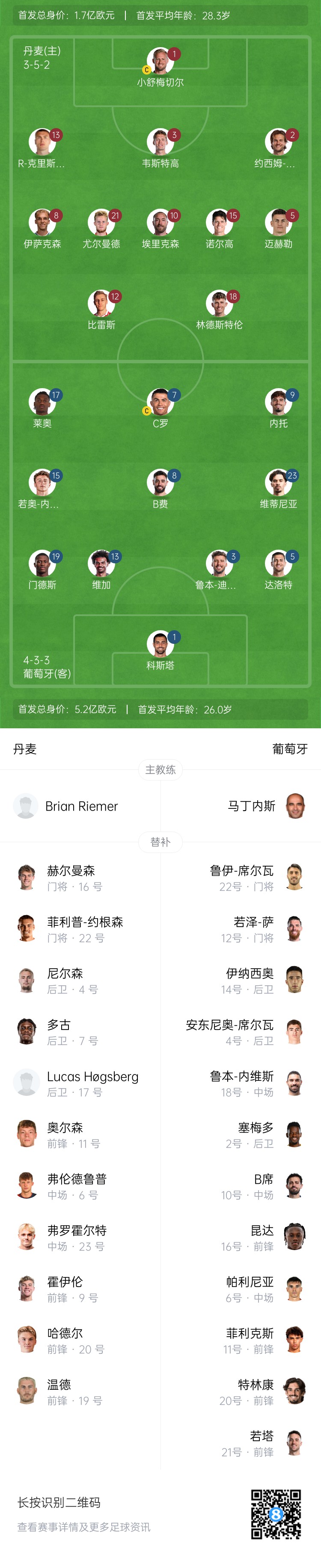 3月21日讯 北京时间03:45,欧国联1/4赛决赛首回合,葡萄牙客场挑战丹麦。赛前官方公布了双方的首发名单。