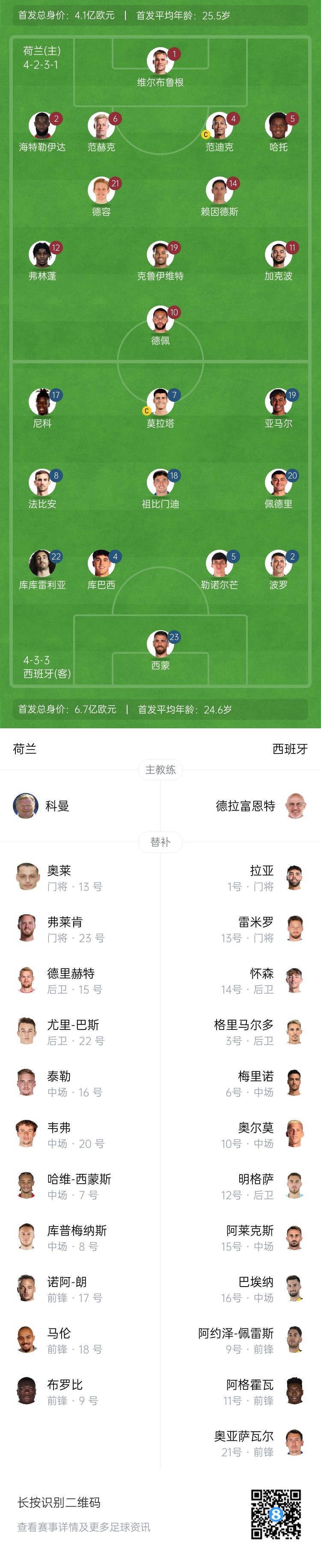 西班牙首发:23-乌奈-西蒙、2-波罗、5-勒诺尔芒、4-库巴西、22-库库雷利亚、18-祖比门迪、20-佩德里、8-法比安、19-亚马尔、17-尼科-威廉姆斯、7-莫拉塔